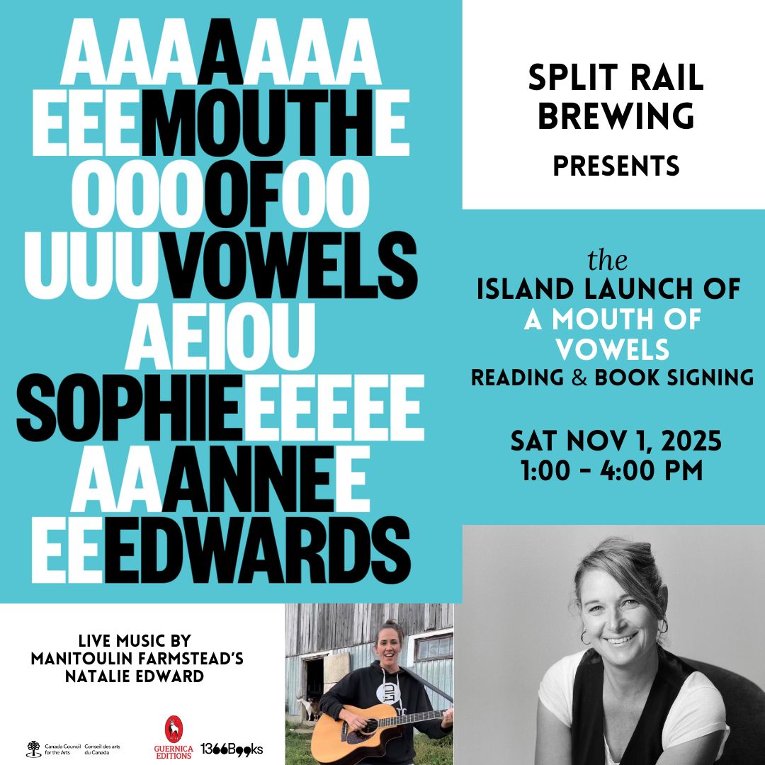 A LITERARY CELEBRATION AWAITS! Join us for a very special afternoon celebrating the Island launch of Sophie Anne Edwards’ captivating new book, 'A Mouth of Vowels' (1366/Guernica Editions). LOCATION: Split Rail, 31 Water Street, Gore Bay DATE: Saturday November 1st, 2025 TIME: 1:00 PM - 4:00 PM WHAT AWAITS YOU: - Author Reading, Q&A & book signing - Books will be available for purchase - Live music by Natalie Edward - Good company & literary conversation Remember last year's magical launch? Those who attended the November 30th 2024 island launch for 'Conversations with the Kagawong River' know what an extraordinary